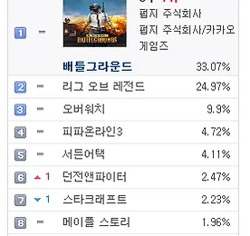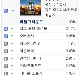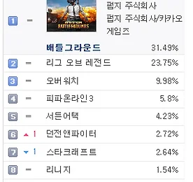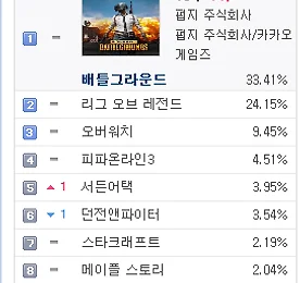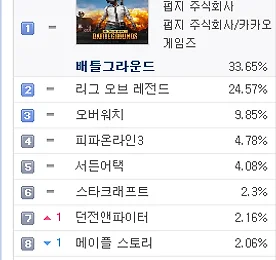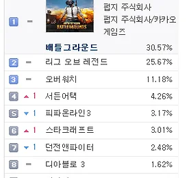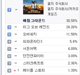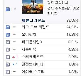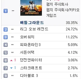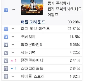 PC방게임순위 썸네일형 리스트형 PC방 게임 순위 - 2018년 1월 21일 기준 PC방 게임 순위 - 2018년 1월 21일 기준 2017년 지식iN 최다 질문 키워드 "배틀그라운드" http://v.media.daum.net/v/20180120130346742 PC방 게임 순위 1위 배틀그라운드 http://www.playbattlegrounds.com/main.pu 2위 리그오브레전드 http://www.leagueoflegends.co.kr/ 3위 오버워치 https://playoverwatch.com/ko-kr/ 4위 피파온라인3 http://fifaonline3.nexon.com/main/index.aspx 5위 서든어택 http://sa.nexon.com/main/index.aspx 6위 던전앤파이터 http://df.nexon.com/df/home 7위 스타크래프트 ht.. 더보기 PC방 게임 순위 - 2018년 1월 18일 기준 PC방 게임 순위 - 2018년 1월 18일 기준 가수 정준영, '배틀그라운드' 프로게이머 된다 http://v.sports.media.daum.net/v/20180118143001460 PC방 게임 순위 1위 배틀그라운드 http://www.playbattlegrounds.com/main.pu 2위 리그오브레전드 http://www.leagueoflegends.co.kr/ 3위 오버워치 https://playoverwatch.com/ko-kr/ 4위 피파온라인3 http://fifaonline3.nexon.com/main/index.aspx 5위 서든어택 http://sa.nexon.com/main/index.aspx 6위 던전앤파이터 http://df.nexon.com/df/home 7위 스타크래프트.. 더보기 PC방 게임 순위 - 2018년 1월 17일 기준 PC방 게임 순위 - 2018년 1월 17일 기준 [롤챔스] SKT, 정글러 '울프' 앞세워 타이거즈에 2대1 승리 http://v.sports.media.daum.net/v/20180118003005011 PC방 게임 순위 1위 배틀그라운드 http://www.playbattlegrounds.com/main.pu 2위 리그오브레전드 http://www.leagueoflegends.co.kr/ 3위 오버워치 https://playoverwatch.com/ko-kr/ 4위 피파온라인3 http://fifaonline3.nexon.com/main/index.aspx 5위 서든어택 http://sa.nexon.com/main/index.aspx 6위 던전앤파이터 http://df.nexon.com/df/hom.. 더보기 PC방 게임 순위 - 2018년 1월 16일 기준 PC방 게임 순위 - 2018년 1월 16일 기준 라이엇게임즈, 리그오브레전드 2018시즌 시작 http://v.media.daum.net/v/20180116130402230 PC방 게임 순위 1위 배틀그라운드 http://www.playbattlegrounds.com/main.pu 2위 리그오브레전드 http://www.leagueoflegends.co.kr/ 3위 오버워치 https://playoverwatch.com/ko-kr/ 4위 피파온라인3 http://fifaonline3.nexon.com/main/index.aspx 5위 서든어택 http://sa.nexon.com/main/index.aspx 6위 스타크래프트 http://kr.blizzard.com/ko-kr/games/sc/ 7위 던전.. 더보기 PC방 게임 순위 - 2018년 1월 2일 기준 PC방 게임 순위 - 2018년 1월 2일 기준 배틀그라운드, LoL에 7% 앞서며 7주 연속 1위 http://v.sports.media.daum.net/v/20180102191659164 PC방 게임 순위 1위 배틀그라운드 http://www.playbattlegrounds.com/main.pu 2위 리그오브레전드 http://www.leagueoflegends.co.kr/ 3위 오버워치 https://playoverwatch.com/ko-kr/ 4위 피파온라인3 http://fifaonline3.nexon.com/main/index.aspx 5위 서든어택 http://sa.nexon.com/main/index.aspx 6위 던전앤파이터 http://df.nexon.com/df/home 7위 스타크래.. 더보기 PC방 게임 순위 - 2017년 12월 25일 기준 PC방 게임 순위 - 2017년 12월 25일 기준 '배틀그라운드' e스포츠, '오버워치' 대리게임 어떤 처분 내리나? http://v.sports.media.daum.net/v/20171225171507823 PC방 게임 순위 1위 배틀그라운드 http://www.playbattlegrounds.com/main.pu 2위 리그오브레전드 http://www.leagueoflegends.co.kr/ 3위 오버워치 https://playoverwatch.com/ko-kr/ 4위 피파온라인3 http://fifaonline3.nexon.com/main/index.aspx 5위 서든어택 http://sa.nexon.com/main/index.aspx 6위 스타크래프트 http://kr.blizzard.com/k.. 더보기 PC방 게임 순위 - 2017년 12월 13일 기준 PC방 게임 순위 - 2017년 12월 13일 기준 OGN, 30억원 투자 배틀그라운드 전용 경기장 설립 http://v.sports.media.daum.net/v/20171214144216052 PC방 게임 순위 1위 배틀그라운드 http://www.playbattlegrounds.com/main.pu 2위 리그오브레전드 http://www.leagueoflegends.co.kr/ 3위 오버워치 https://playoverwatch.com/ko-kr/ 4위 피파온라인3 http://fifaonline3.nexon.com/main/index.aspx 5위 서든어택 http://sa.nexon.com/main/index.aspx 6위 던전앤파이터 http://df.nexon.com/df/home 7위 스.. 더보기 PC방 게임 순위 - 2017년 12월 5일 기준 PC방 게임 순위 - 2017년 12월 4일 기준 '리그오브레전드 올스타전' 7일 미국 LA서 개막 '드림팀 대결' http://v.sports.media.daum.net/v/20171204202403929 PC방 게임 순위 1위 배틀그라운드 http://www.playbattlegrounds.com/main.pu 2위 리그오브레전드 http://www.leagueoflegends.co.kr/ 3위 오버워치 https://playoverwatch.com/ko-kr/ 4위 피파온라인3 http://fifaonline3.nexon.com/main/index.aspx 5위 서든어택 http://sa.nexon.com/main/index.aspx 6위 던전앤파이터 http://df.nexon.com/df/hom.. 더보기 PC방 게임 순위 - 2017년 12월 3일 기준 PC방 게임 순위 - 2017년 12월 3일 기준 PC방 게임 순위 1위 배틀그라운드 http://www.playbattlegrounds.com/main.pu 2위 리그오브레전드 http://www.leagueoflegends.co.kr/ 3위 오버워치 https://playoverwatch.com/ko-kr/ 4위 피파온라인3 http://fifaonline3.nexon.com/main/index.aspx 5위 서든어택 http://sa.nexon.com/main/index.aspx 6위 던전앤파이터 http://df.nexon.com/df/home 7위 스타크래프트 http://kr.blizzard.com/ko-kr/games/sc/ 8위 메이플스토리 http://maplestory.nexon.com.. 더보기 PC방 게임 순위 - 2017년 11월 29일 기준 PC방 게임 순위 - 2017년 11월 29일 기준 '핵' 때문에 골머리 앓는 배틀그라운드 http://v.sports.media.daum.net/v/20171129143304816 ㅡ PC방 게임 순위 1위 배틀그라운드 http://www.playbattlegrounds.com/main.pu 2위 리그오브레전드 http://www.leagueoflegends.co.kr/ 3위 오버워치 https://playoverwatch.com/ko-kr/ 4위 피파온라인3 http://fifaonline3.nexon.com/main/index.aspx 5위 서든어택 http://sa.nex