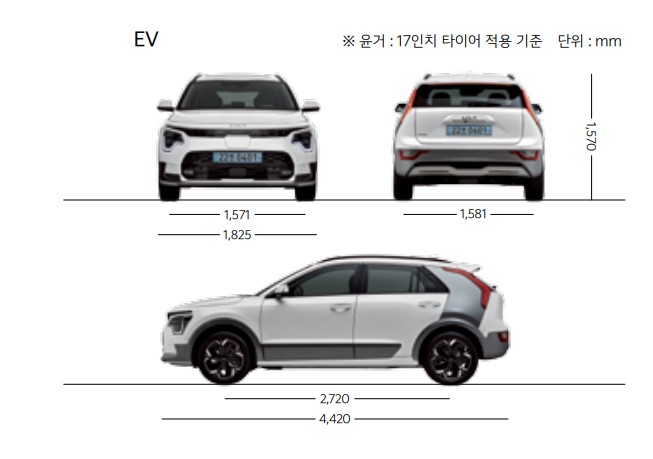 2023 니로 EV 제원은 전장 4420mm / 전폭은 1825mm / 전고는 1570mm / 휠베이스는 2720mm 입니다.