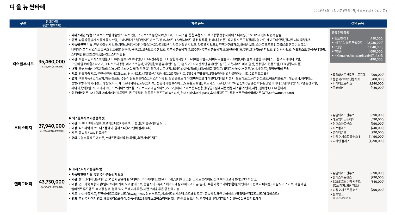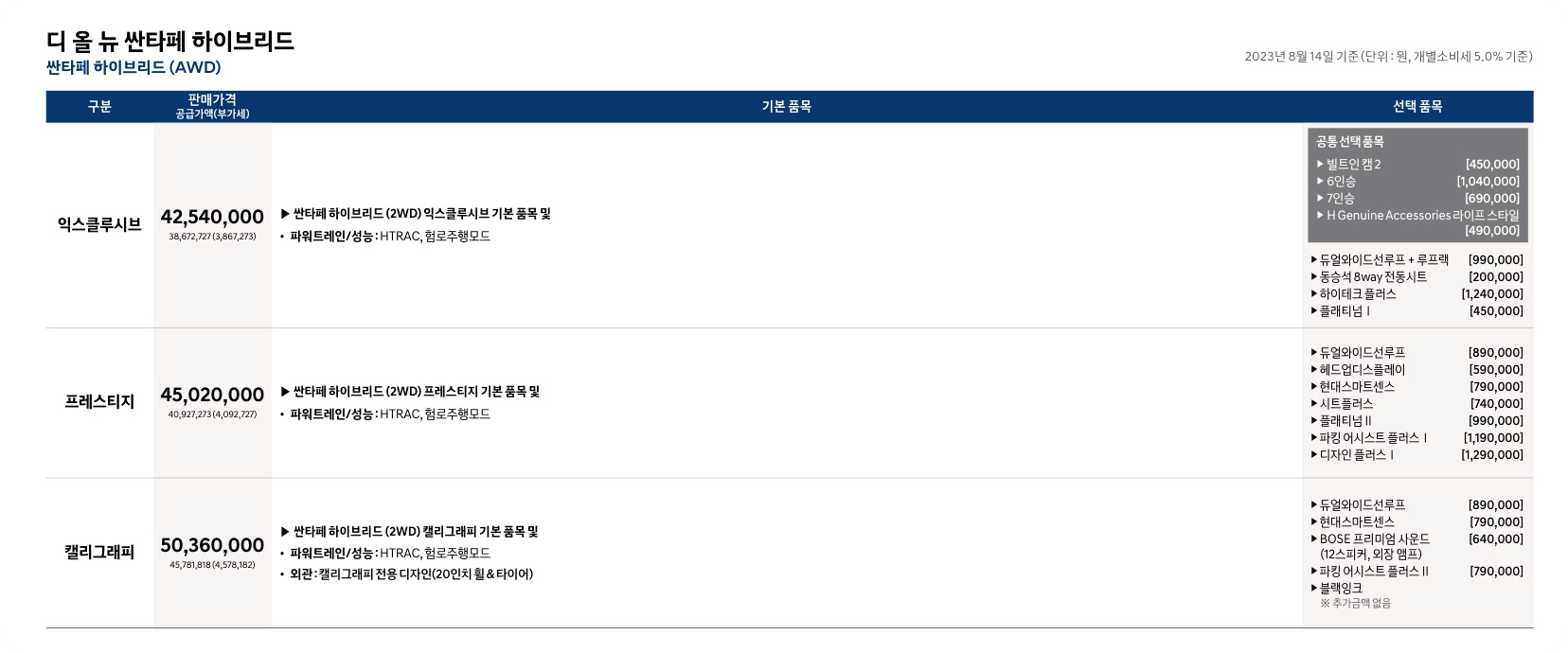 새로운 싼타페는 다양한 트림 옵션으로 출시되며, 기본 트림부터 최고 트림까지 다양한 기능이 제공됩니다. 가격대를 살펴보면 익스클루시브 트림부터 시작하여 캘리그래피 트림까지 순차적으로 가격이 상승합니다. 이때 캘리그래피 트림은 최상위 모델로 가장 높은 가격을 보이며, 추가 옵션을 고려하면 5천만원대까지 상승하는 것으로 보입니다.